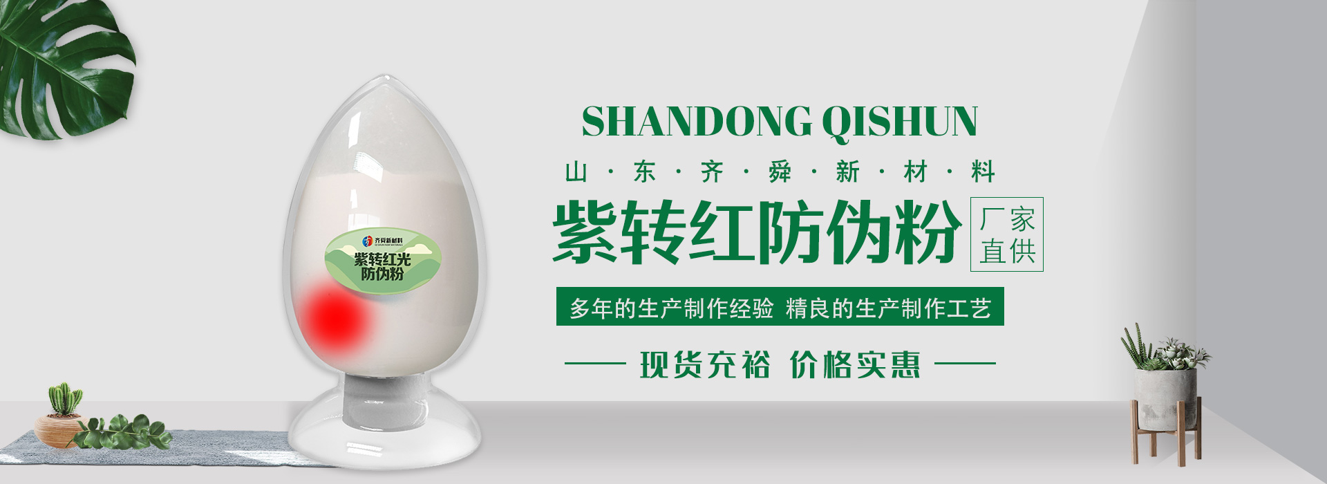 我公司前身為2011年成立的淄博舜明熒光科技有限公司。隨著公司的發(fā)展,廠址從淄博搬遷到青島,2020年5月公司重新注冊(cè)為山東齊舜新材料有限公司。公司注冊(cè)資本2000萬(wàn)元,主要從事新材料研究和開發(fā)。目前主要產(chǎn)品包括:農(nóng)膜用轉(zhuǎn)光粉、轉(zhuǎn)光母粒以及轉(zhuǎn)光農(nóng)膜;農(nóng)膜用長(zhǎng)效防霧流滴涂覆液;復(fù)合肥添加劑及葉面肥(稀土微肥);防偽粉;LED封裝熒光粉;夜光粉;太陽(yáng)能光伏電池增效熒光粉;鋰電池正極材料等。